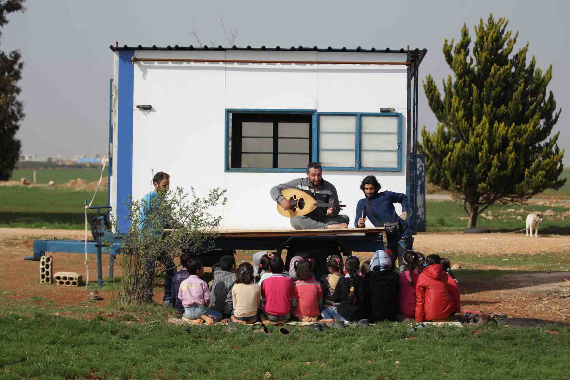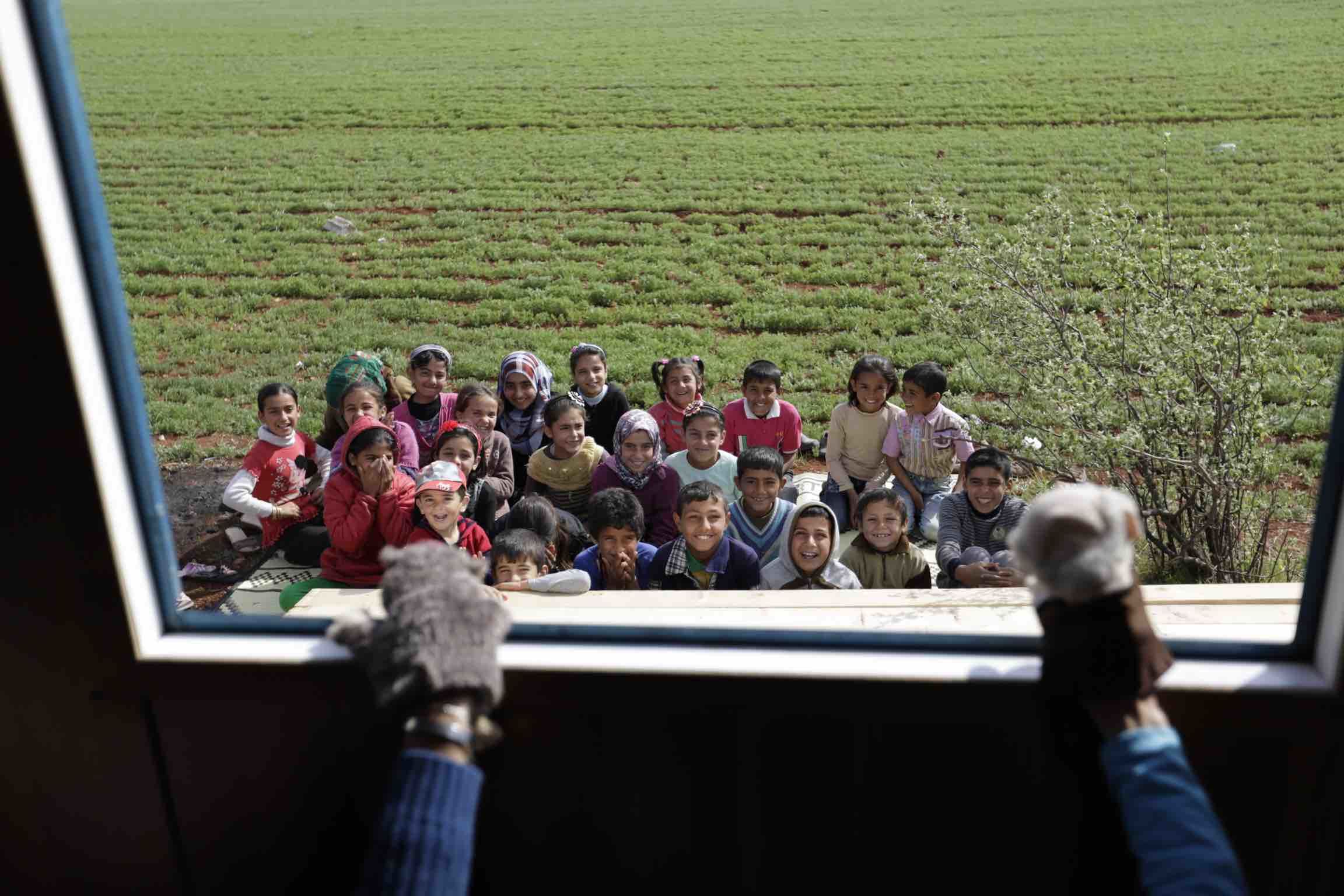 وما إن ينتهي الدرس حتى يخرج الطلاب من الكرافان ويجلسون على الأرض مقابل إحدى نوافذه، فقد حان موعد مسرح العرائس.