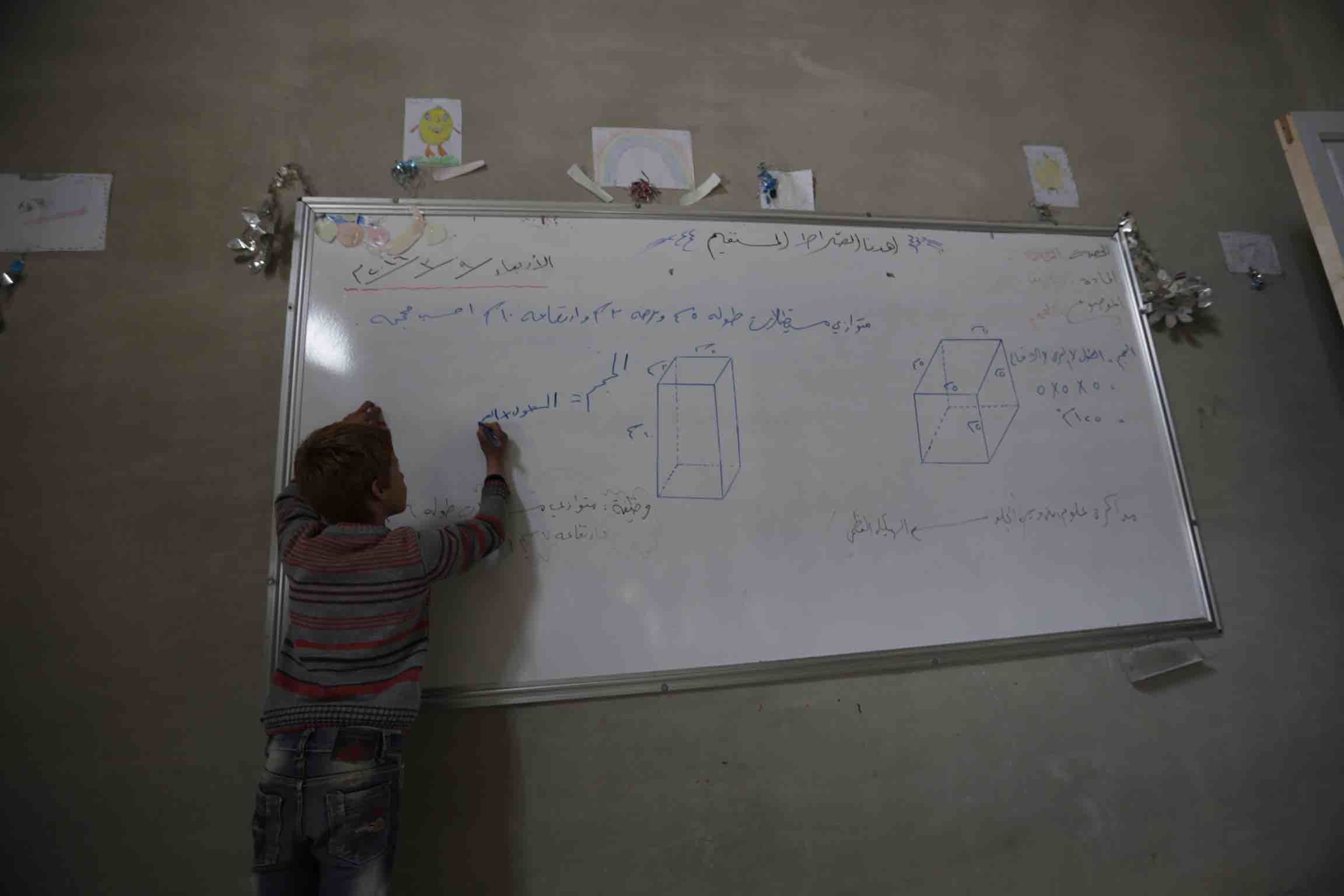 في هذا الصف ستجد لوحاً أبيض اللون معلق على أحد جدرانها، وشريطاً متهالك يحمل لمبة صغيرة لإنارة المكان.