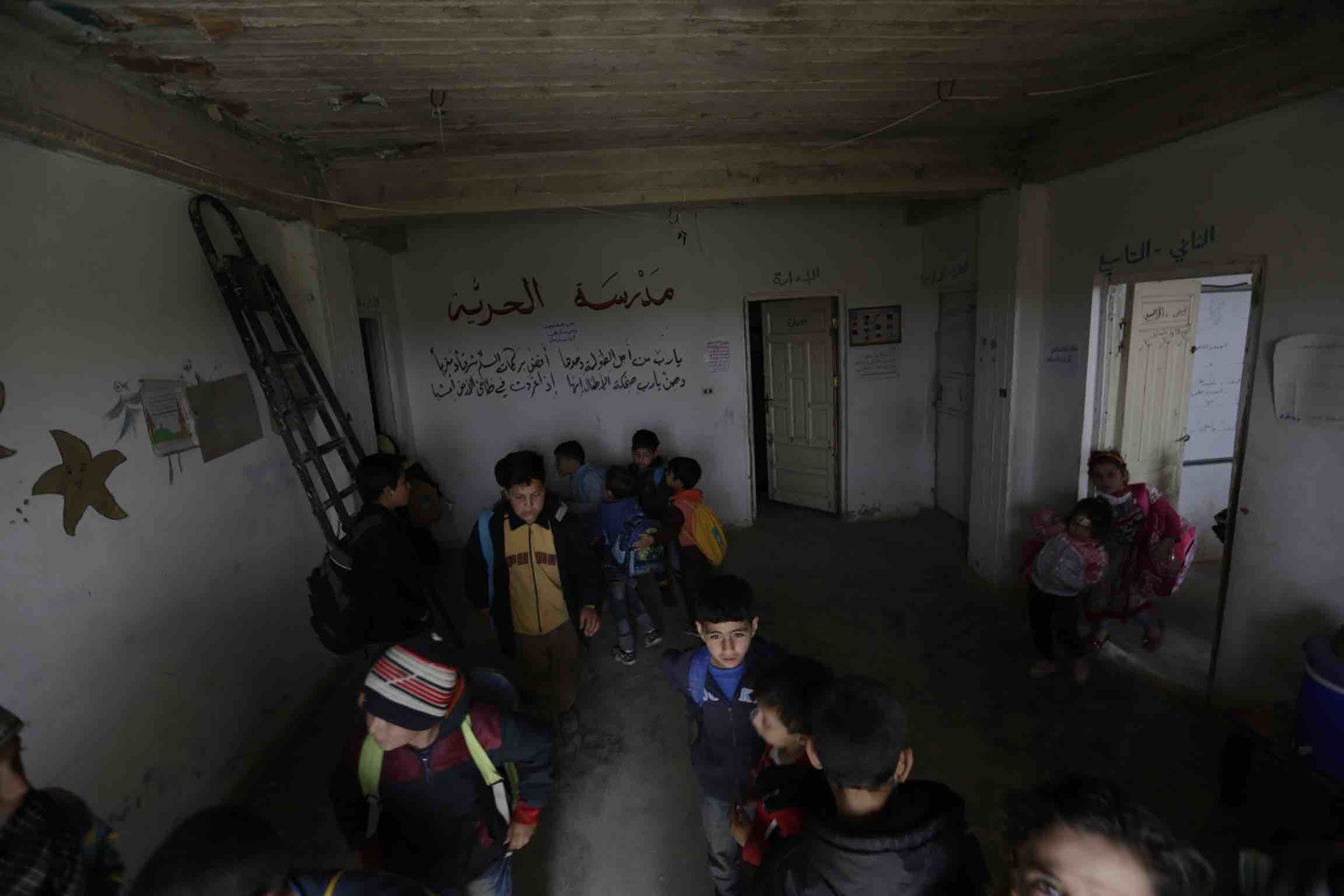 ربما الإضاءة هي أصغر مشاكلهم، فلا مقاعد ولا نوافذ فيها فقط دمار وعدد من الجدران يجتمع فيها الطلاب لتلقي الدروس.