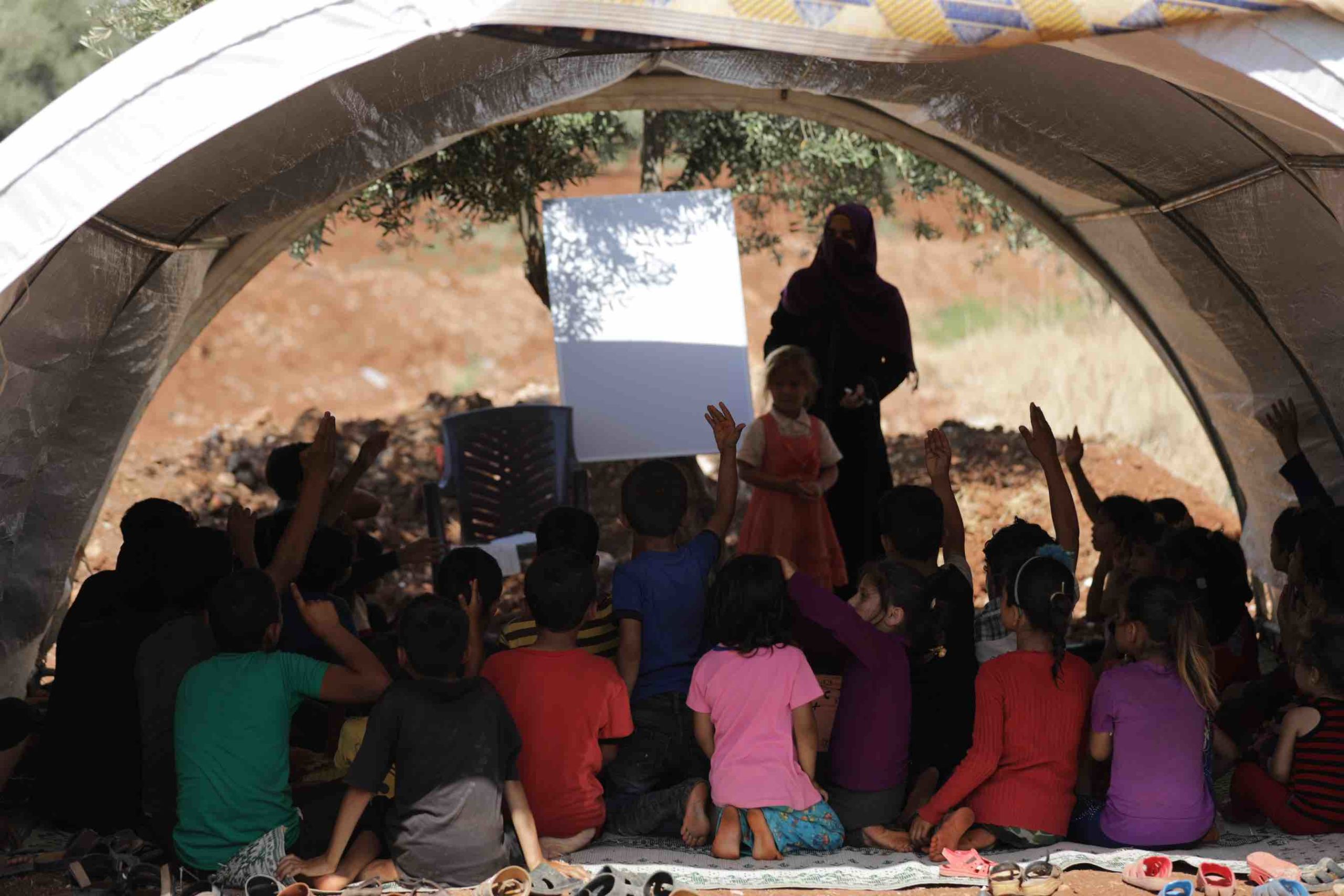 Rahaf, a 22-year-old displaced girl coming from rural Hama, was the one who came up with the idea of establishing a “tent school”. She teaches lessons at the school with help from another female teacher. The two young women had pitched the tent after paving a piece of land near the olive trees in rural Idlib.