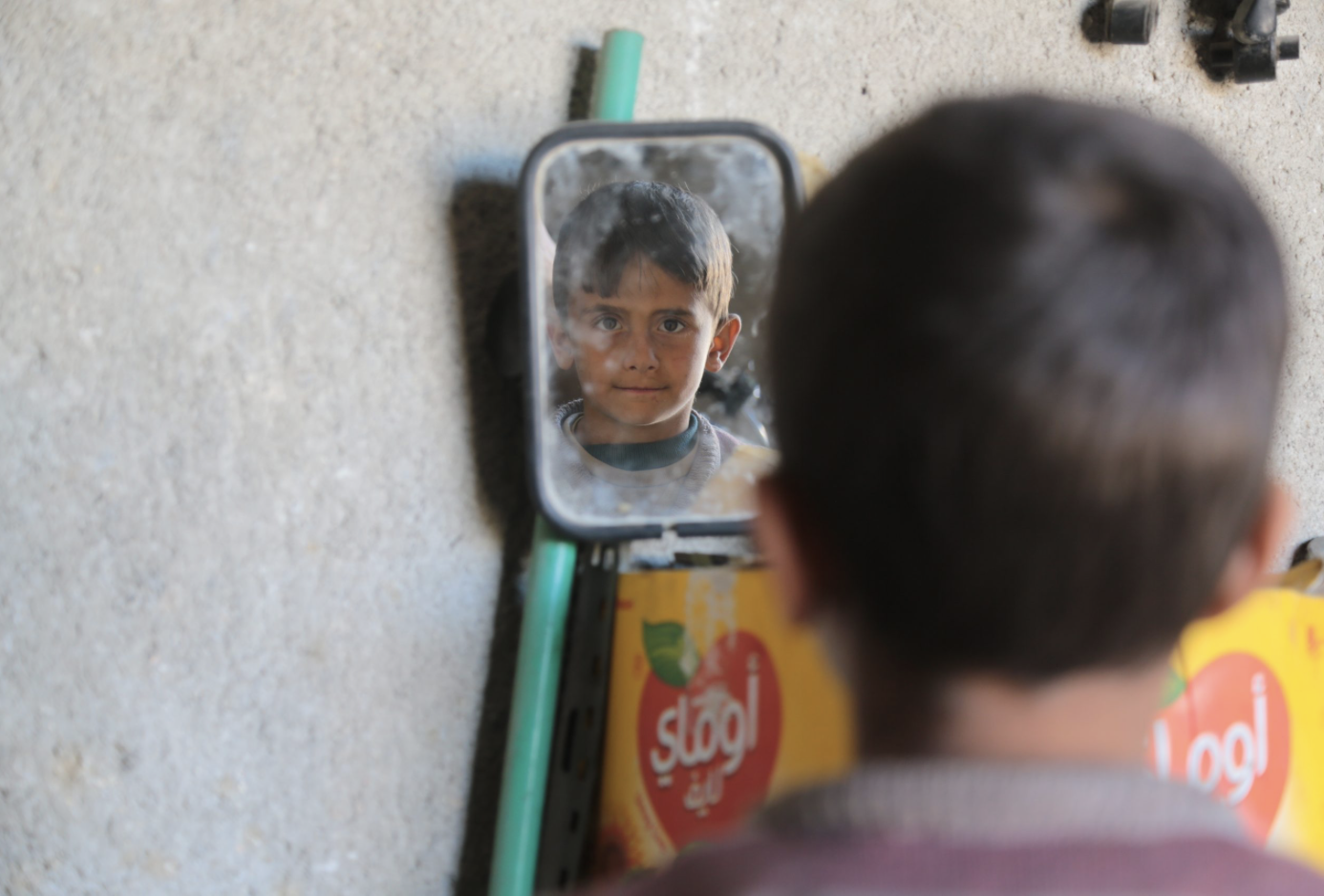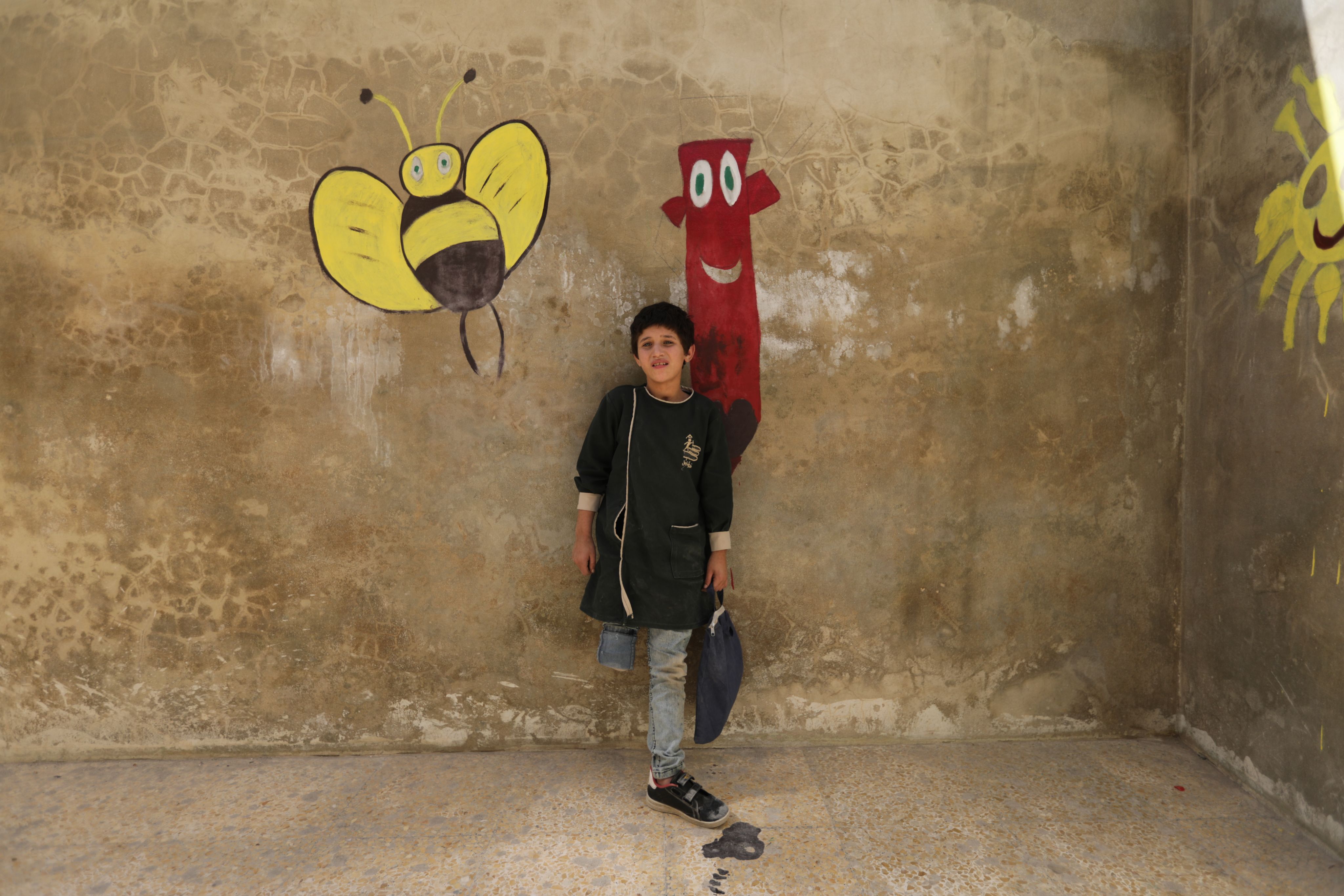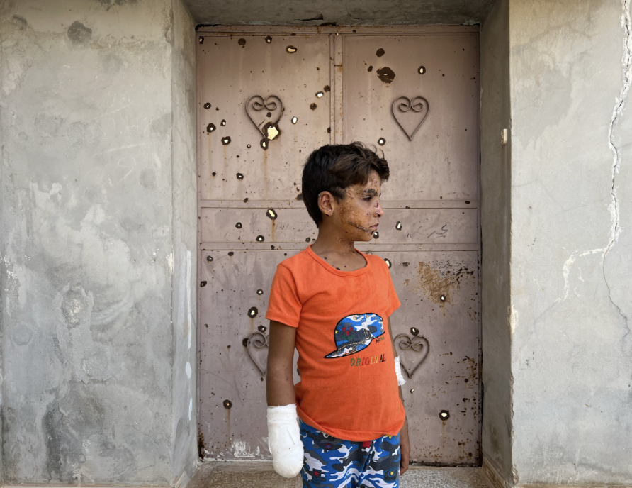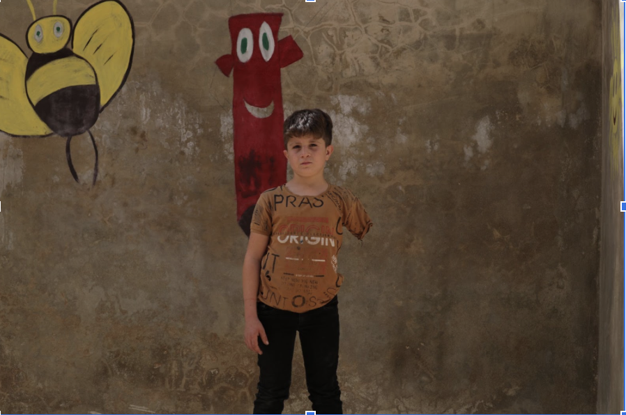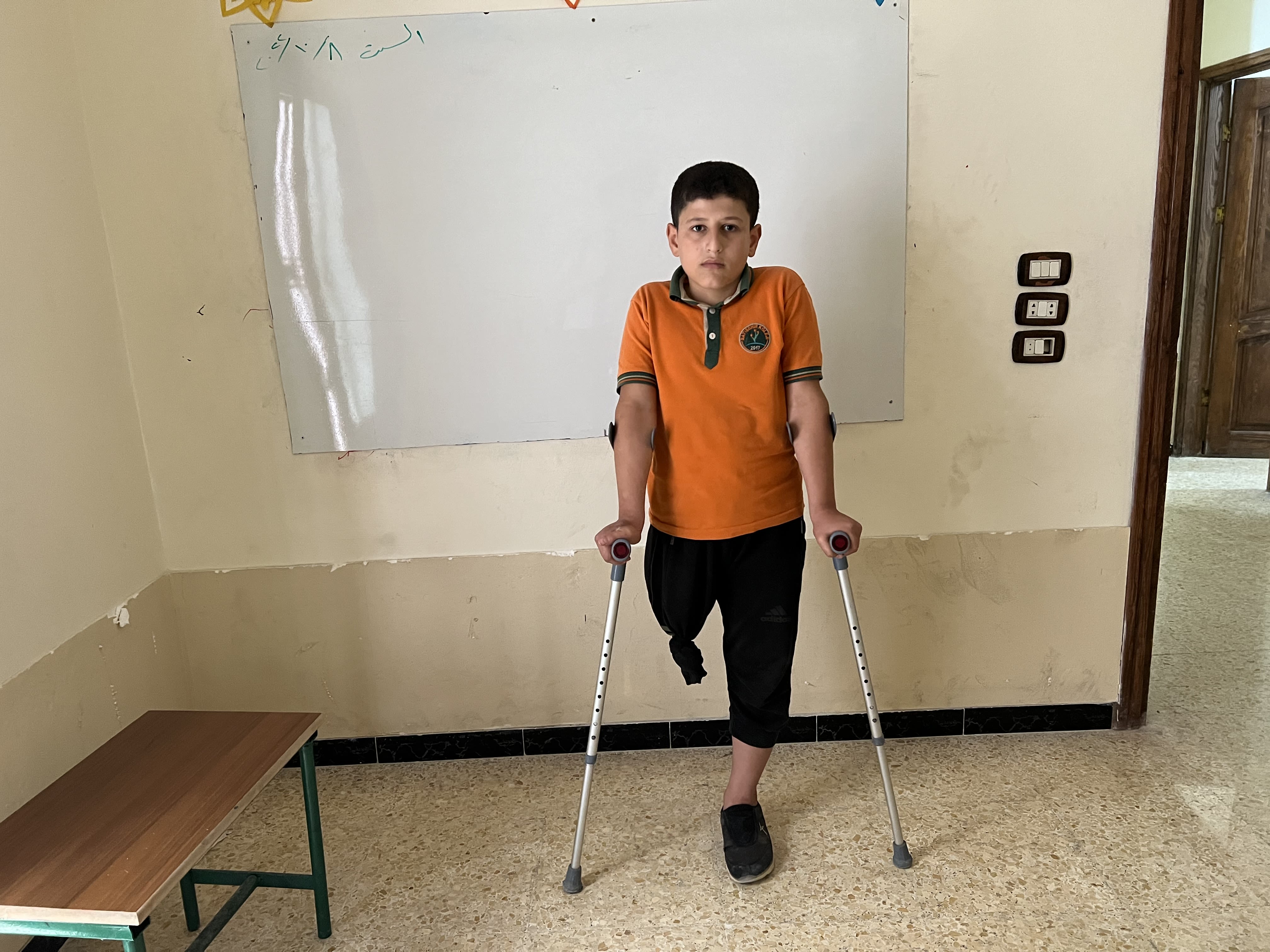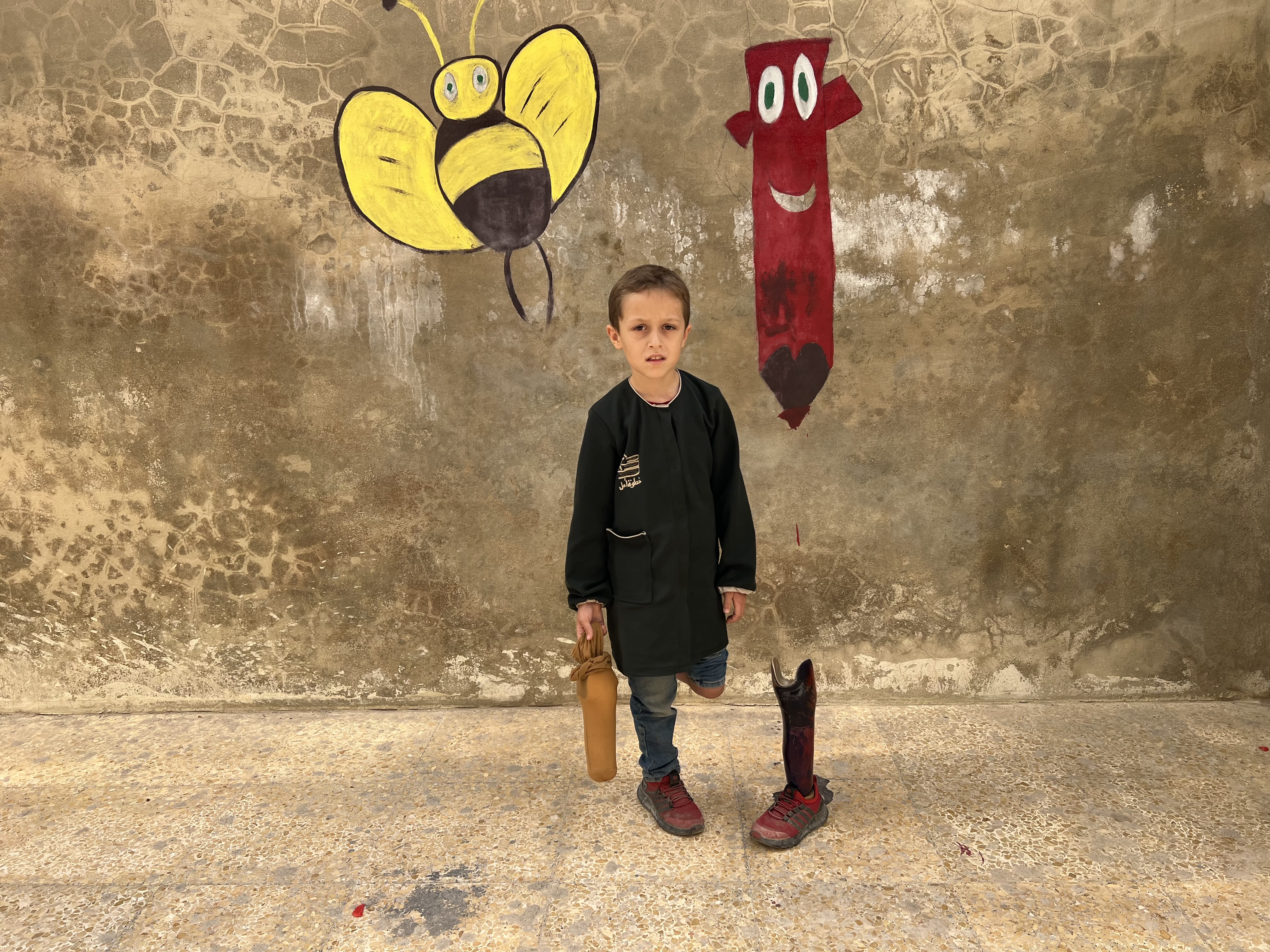 محمد، البالغ من العمر ٨ سنوات، من إدلب، فقد قدمه نتيجة قصف الطيران، كان عمره ٤ سنوات عندما فقد قدمه، ولا يتذكر تفاصيل ما حدث.