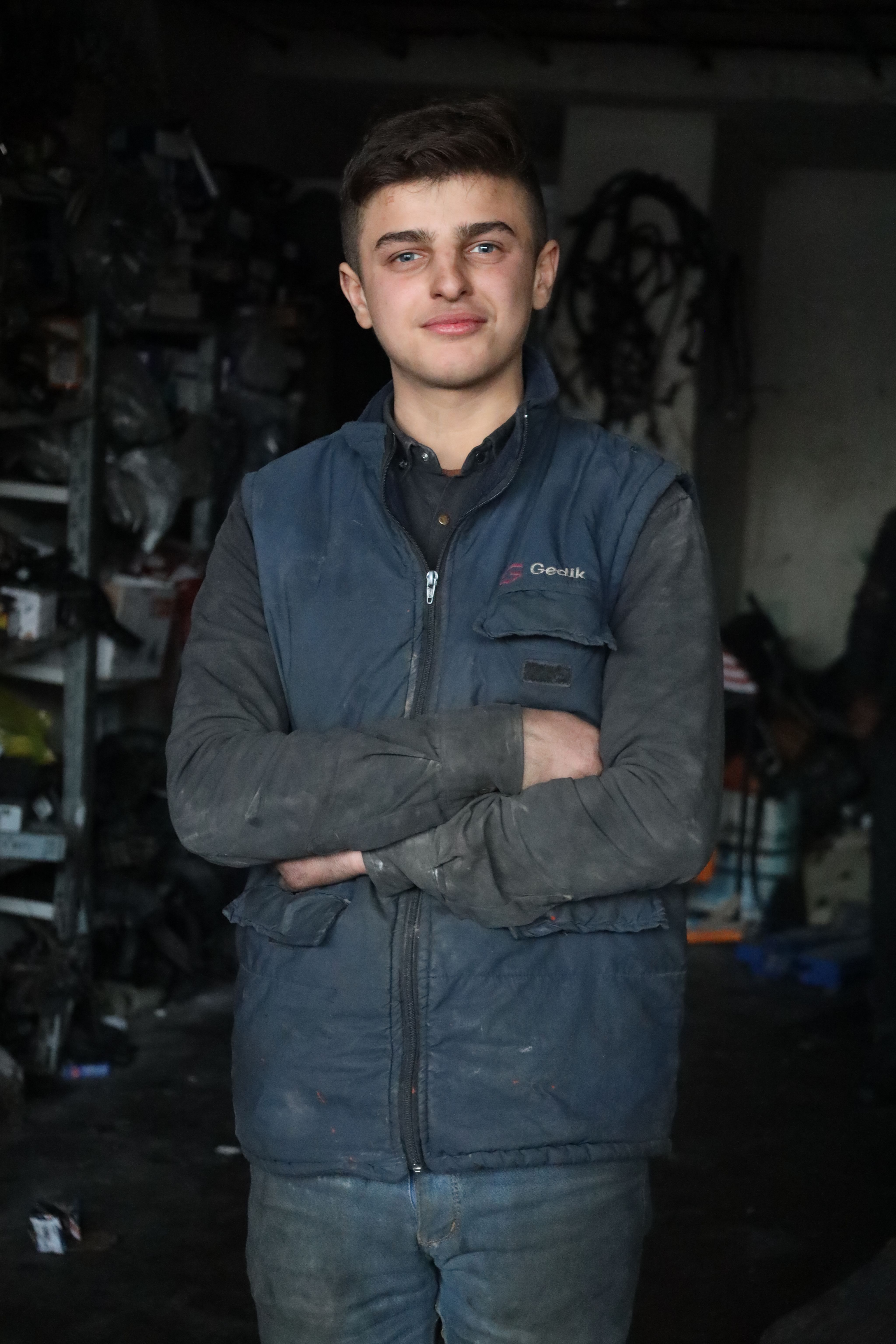 At 14 years old, Ali has been working in this car repair shop for the past two years. He is not from Jandaris, a town near Aleppo, but rather, his family had fled from Idlib in search of safety. His father found refuge in Jandaris, hoping to shield his children from the brutal airstrikes that devastated their hometown.